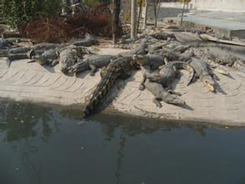 大小不一的鳄鱼有的在水中缓缓游动,有的则在岸上闭目养神。姚绍君说,自从这些鳄鱼安家以来,这里俨然成了一个动物园,每天慕名前来看稀奇的人络绎不绝。姚绍君将六七亩的场地圈起来,挖了池塘,养了一群鸡鸭等,专喂鳄鱼。“养鳄鱼比养猪养鸡还要简单,一般每日喂两次,半个月换一次水。”姚绍君告诉记者。平时他给鳄鱼喂鸡、鸭、肉,有时也投喂蟾蜍。“它们的生命力很旺盛,免疫力也很强,即使吃了兽禽养殖场死、淘汰的猪、鸡也不会生病。”姚绍君说。冬眠时,鳄鱼几乎不吃任何东西,靠肚子里的脂肪来补充体内的营养。