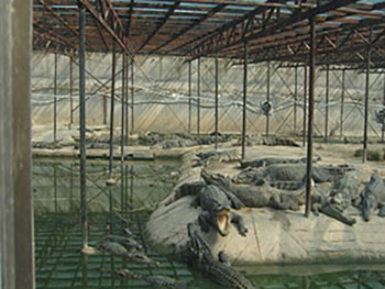 大小不一的鳄鱼有的在水中缓缓游动,有的则在岸上闭目养神。姚绍君说,自从这些鳄鱼安家以来,这里俨然成了一个动物园,每天慕名前来看稀奇的人络绎不绝。姚绍君将六七亩的场地圈起来,挖了池塘,养了一群鸡鸭等,专喂鳄鱼。“养鳄鱼比养猪养鸡还要简单,一般每日喂两次,半个月换一次水。”姚绍君告诉记者。平时他给鳄鱼喂鸡、鸭、肉,有时也投喂蟾蜍。“它们的生命力很旺盛,免疫力也很强,即使吃了兽禽养殖场死、淘汰的猪、鸡也不会生病。”姚绍君说。冬眠时,鳄鱼几乎不吃任何东西,靠肚子里的脂肪来补充体内的营养。