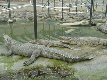 大小不一的鳄鱼有的在水中缓缓游动,有的则在岸上闭目养神。姚绍君说,自从这些鳄鱼安家以来,这里俨然成了一个动物园,每天慕名前来看稀奇的人络绎不绝。姚绍君将六七亩的场地圈起来,挖了池塘,养了一群鸡鸭等,专喂鳄鱼。“养鳄鱼比养猪养鸡还要简单,一般夏季每天投喂一次,冬季几天投食一次。”姚绍君告诉记者。平时他给鳄鱼喂鸡、鸭、肉,有时也投喂蟾蜍。“它们的生命力很旺盛,免疫力也很强,即使吃了腐烂的猪、鸡等食物也不会生病。”姚绍君说。冬眠时,鳄鱼几乎不吃任何东西,靠肚子里的脂肪来补充体内的营养。盐城特种鳄鱼养殖基地